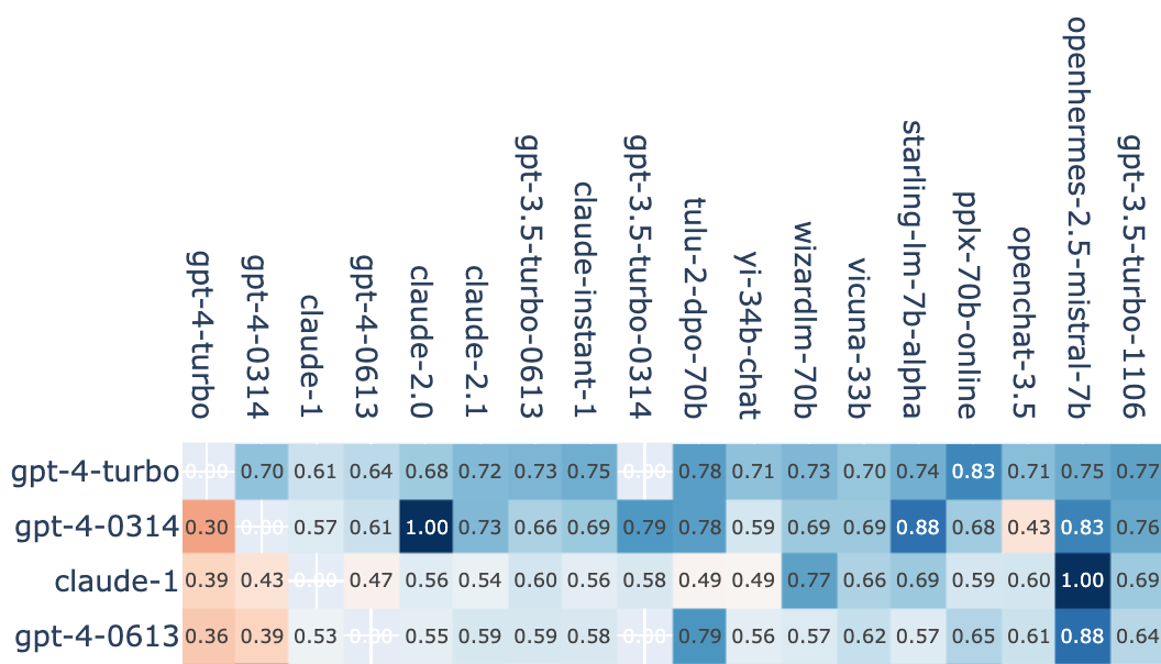 To address this problem, we have brought up gpt-4-0314 online again to collect new votes, also directly comparing it against its newer 0613 version. At the time of writing we have collected 1,000 new votes for gpt-4-0314 and its performance is still robust from winrate over other models shown below. We’ll give more updates on this in the future.