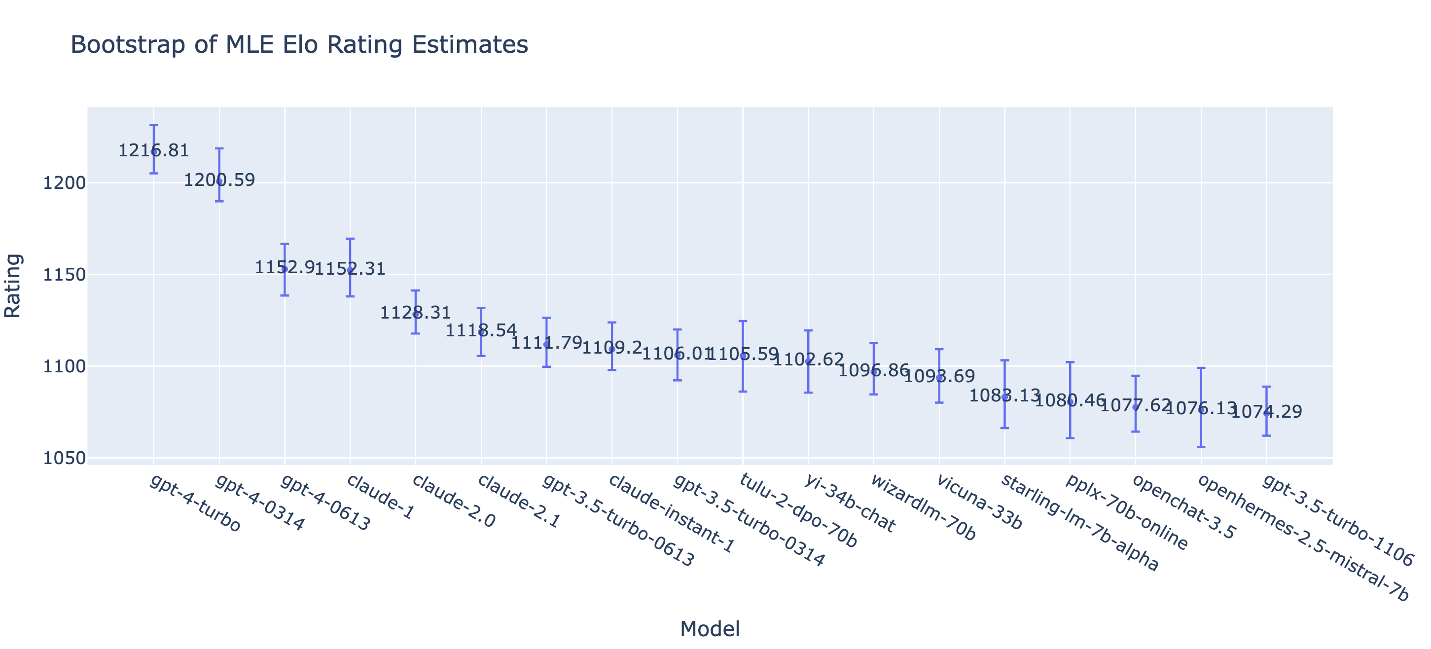Similarly, we can also bootstrap the MLE Bradley-Terry scores to obtain the confidence intervals of model ratings. We observe that the mean rating by both methods are very similar and the rankings are almost the same.