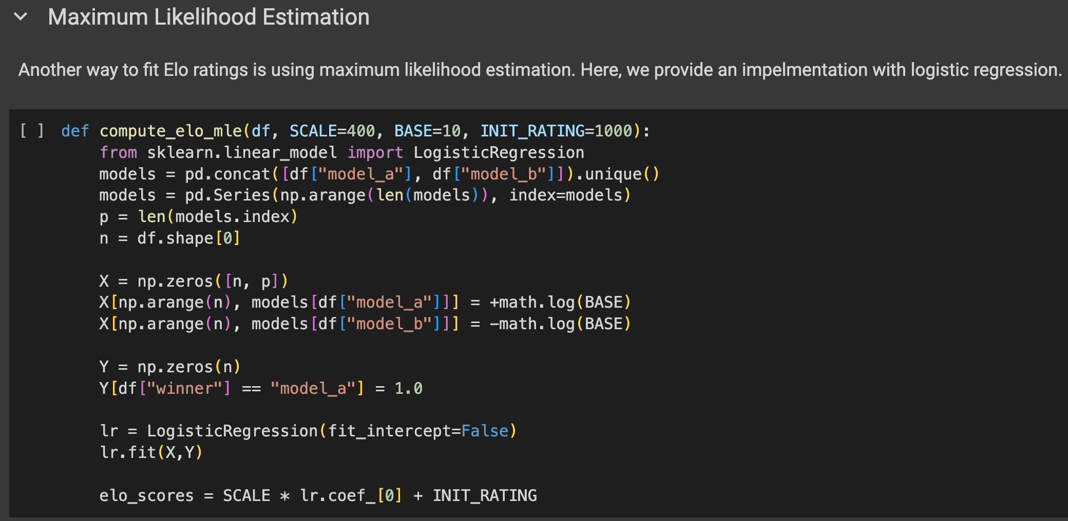 With the static performance assumption, the model ratings can be obtained by maximum likelihood estimation (MLE), i.e. maximizing the likelihood of the observed game outcomes given the model ratings. Code snippet below shows how to use MLE to compute the model ratings.