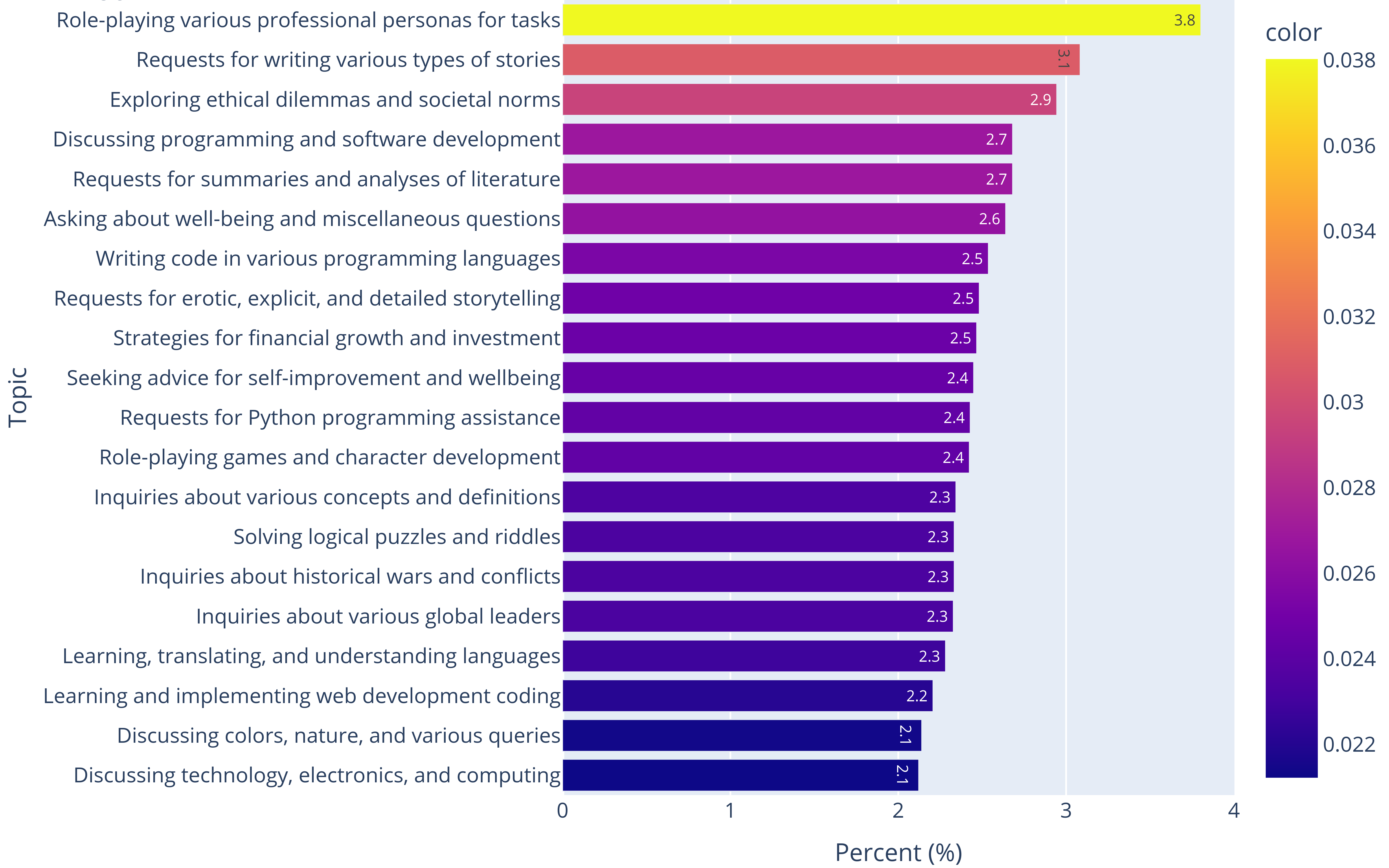 We’ve also conducted topic modeling on 50,000 user prompts to better understand how users interact with these models. Our approach utilized OpenAI embeddings text-embedding-ada-002 and K-means clustering, followed by GPT-4 to summarize the topics for each cluster, provided with the prompts close to the center. This analysis revealed a wide range of topics, from role-playing, story writing to programming advice. We show the topic distribution and a few examples below.