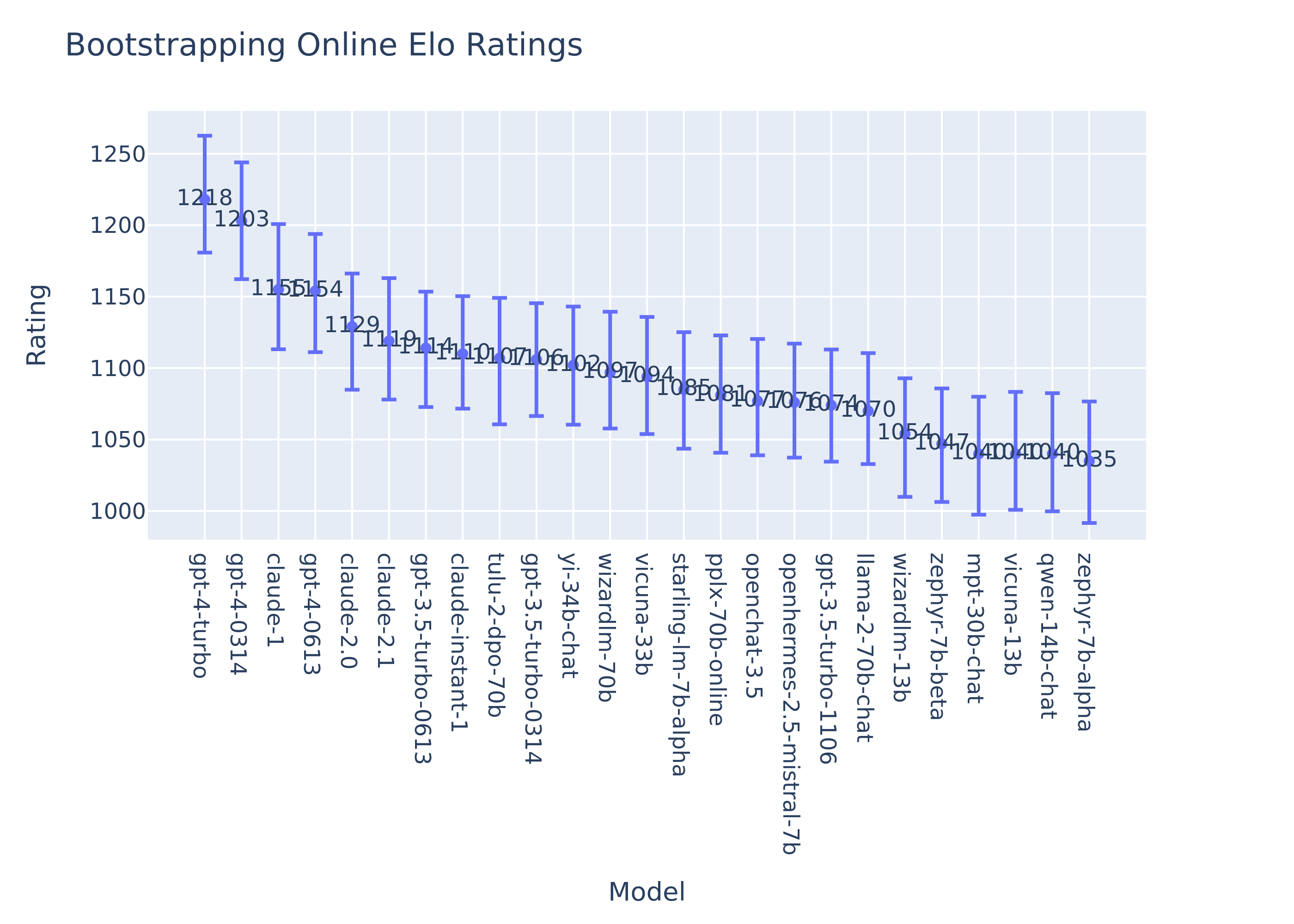 When we launched the Arena, we noticed considerable variability in the ratings using the classic online algorithm. We tried to tune the K to be sufficiently stable while also allowing new models to move up quickly in the leaderboard. We ultimately decided to adopt a bootstrap-like technique to shuffle the data and sample Elo scores from 1000 permutations of the online plays. You can find the details in this notebook. This provided consistent stable scores and allowed us to incorporate new models quickly. This is also observed in a recent work by Cohere. However, we used the same samples to estimate confidence intervals which were therefore too wide (effectively CI’s for the original online Elo estimates).
