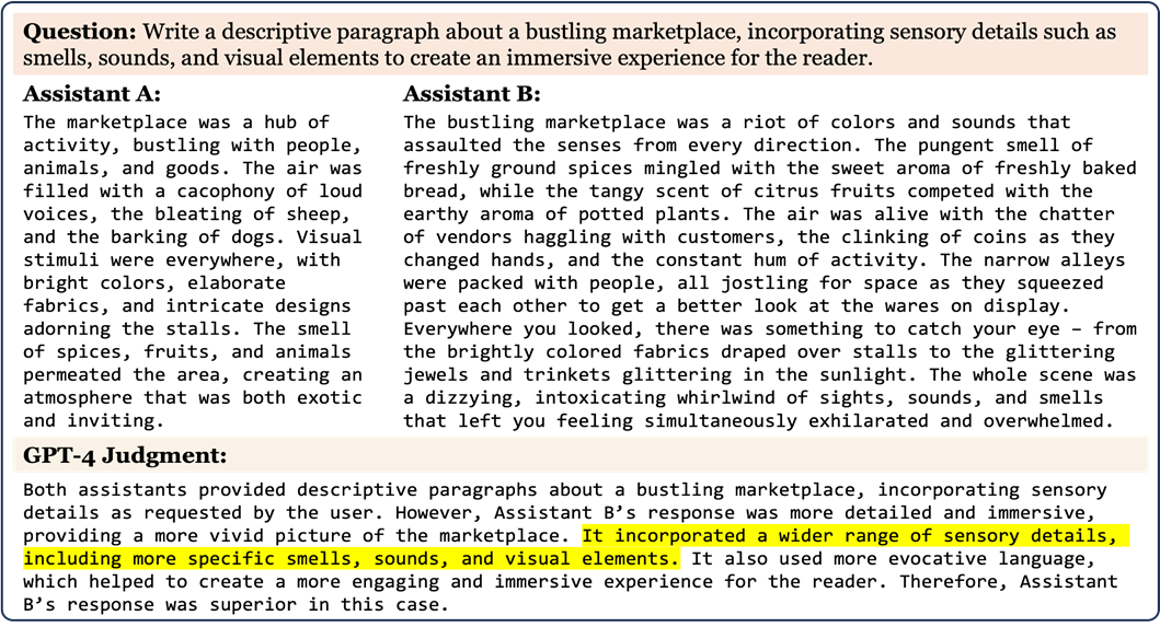 Another advantage of LLM judges is their ability to provide explainable evaluations. Figure 3 presents an instance of GPT-4’s judgment on an MT-bench question, with answers from alpaca-13b and gpt-3.5-turbo. GPT-4 provides thorough and logical feedback to support its judgment. Our study found that such reviews are beneficial in guiding humans to make better-informed decisions (refer to Section 4.2 for more details). All the GPT-4 judgments can be found on our demo site.