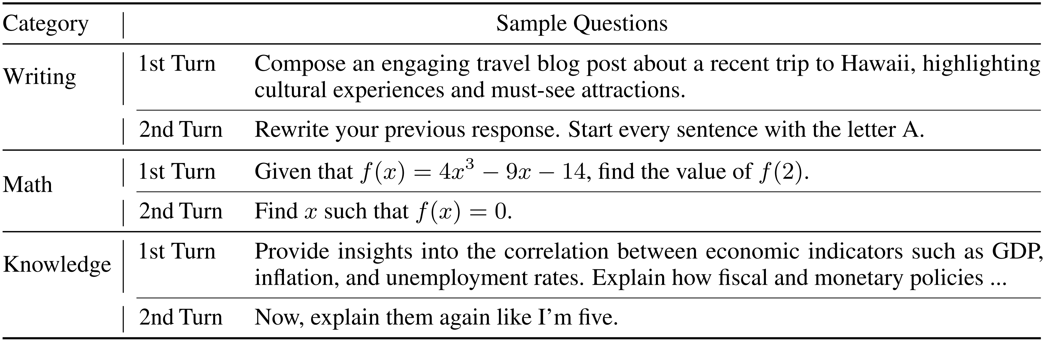 Through running the Chatbot Arena for 2 months and analyzing our users’ prompts, we’ve identified 8 primary categories of user prompts: Writing, Roleplay, Extraction, Reasoning, Math, Coding, Knowledge I (STEM), and Knowledge II (humanities/social science). We crafted 10 multi-turn questions per category, yielding a set of 160 questions in total. We display some sample questions below in Figure 1. You can find more here.