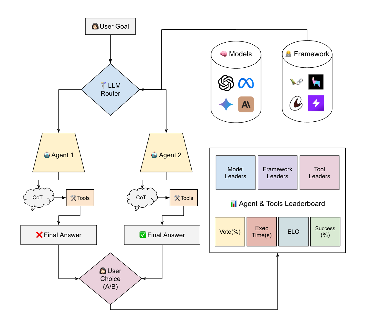 The evaluation process includes voting on agent performance, with users assessing which agent met the task’s requirements more effectively. This user-driven evaluation contributes to an evolving leaderboard system, which ranks agents based on their relative performance across multiple tasks and competitions. This comparison is not limited to the agents as a whole but extends to the individual components (i.e., LLM models, tools, and frameworks) that comprise each agent.
