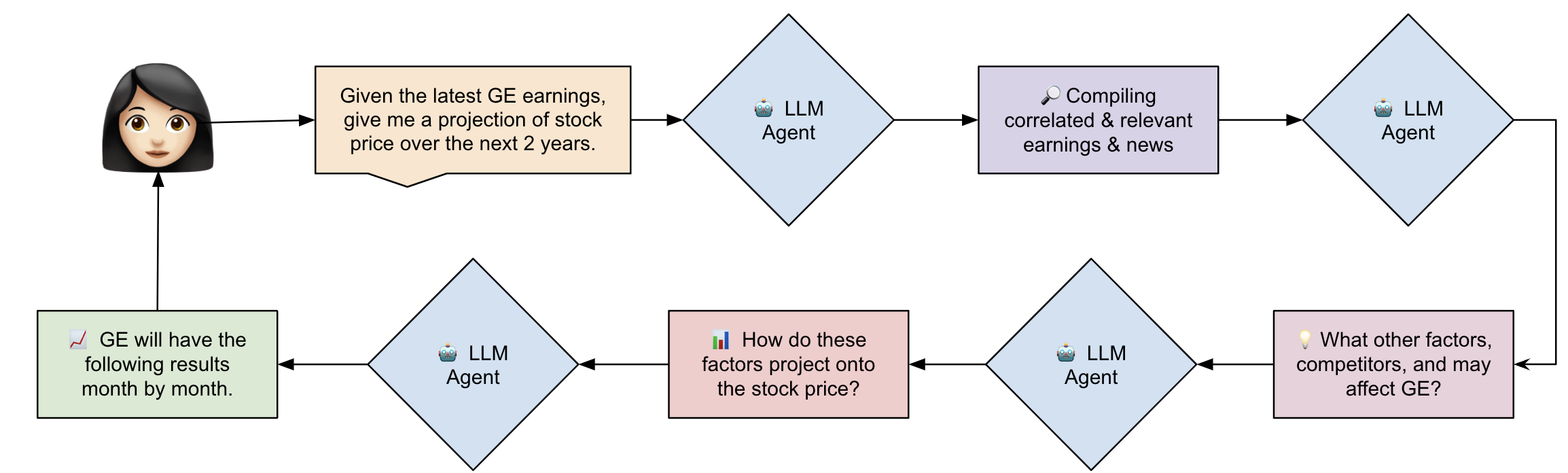 Figure 6: Example flow of LLM agents providing projections and insights on GE stock prices based on relevant earnings and competitors