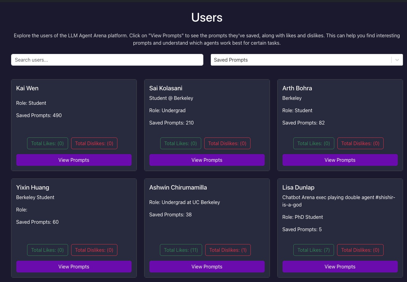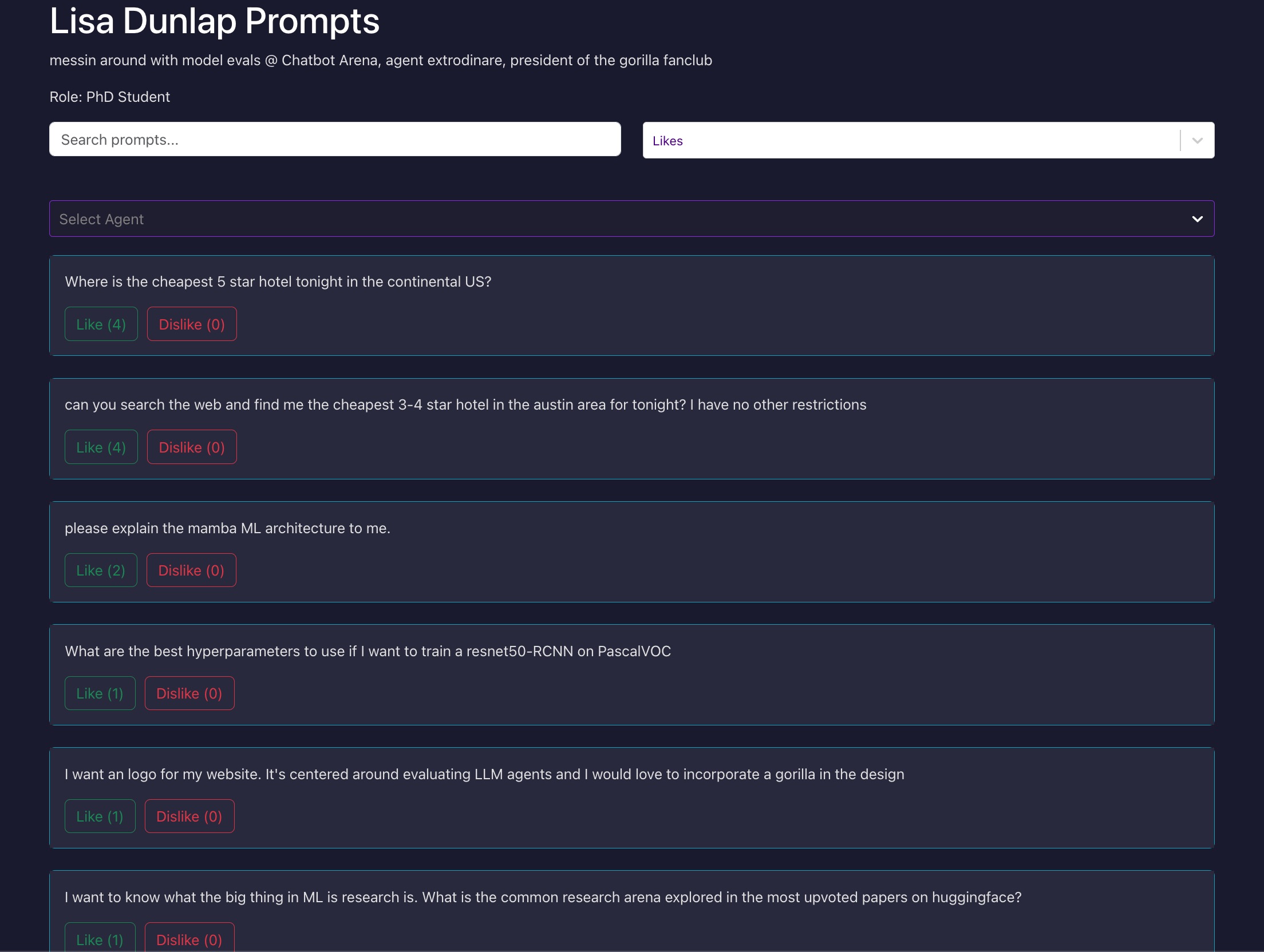 Additionaly, users can provide feedback to other users on their individual prompts through the prompt hub by liking and disliking individual prompts. This provides an additional data point for future for prompt analytics to potentially evaluate domain-specific performance of various agents in the arena.