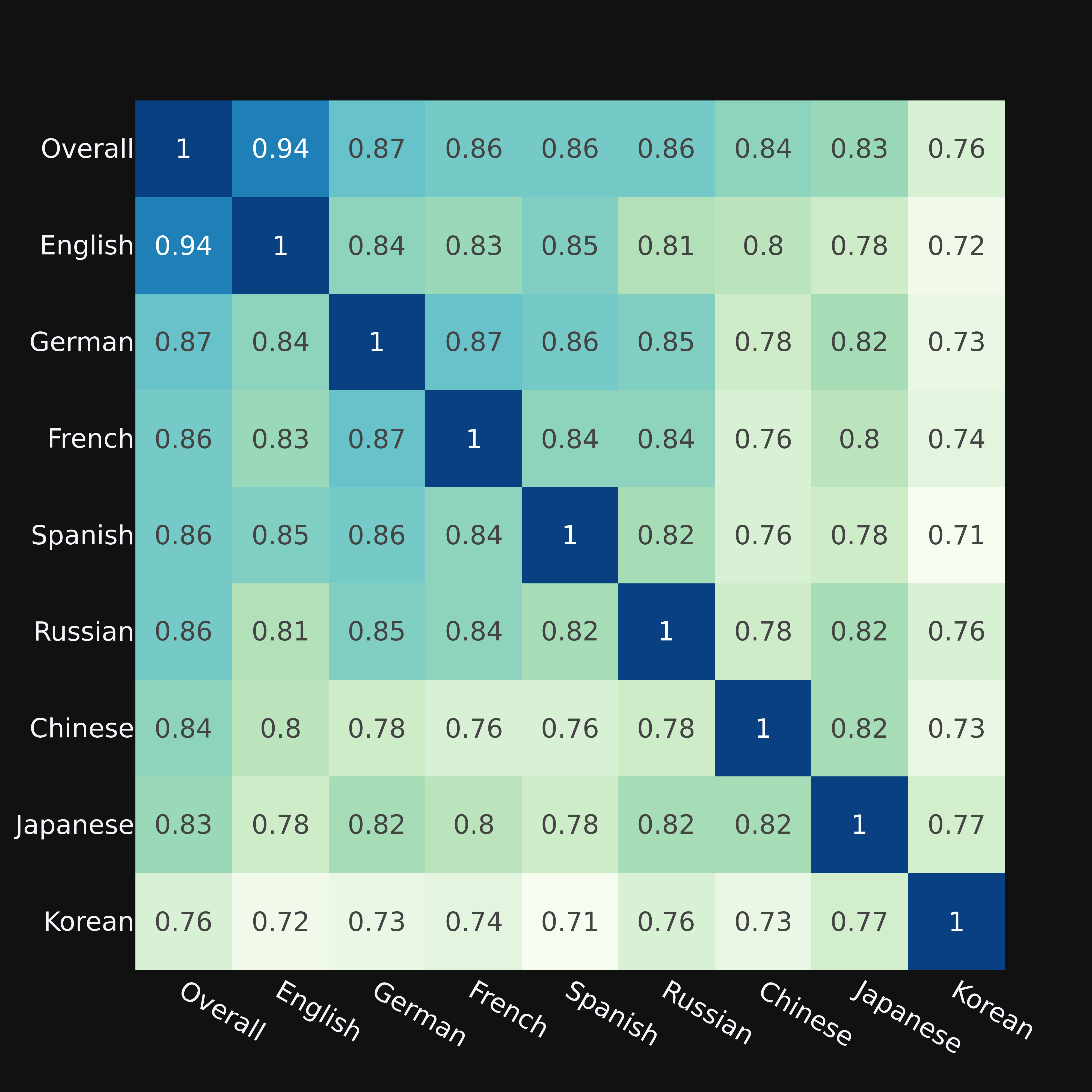 Above Figure 4 reports the Kendall correlation between different languages. Latin based languages exhibit higher correlations with one another. Chinese is most highly correlated with Japanese. Korean exhibits weaker correlations with the other languages.