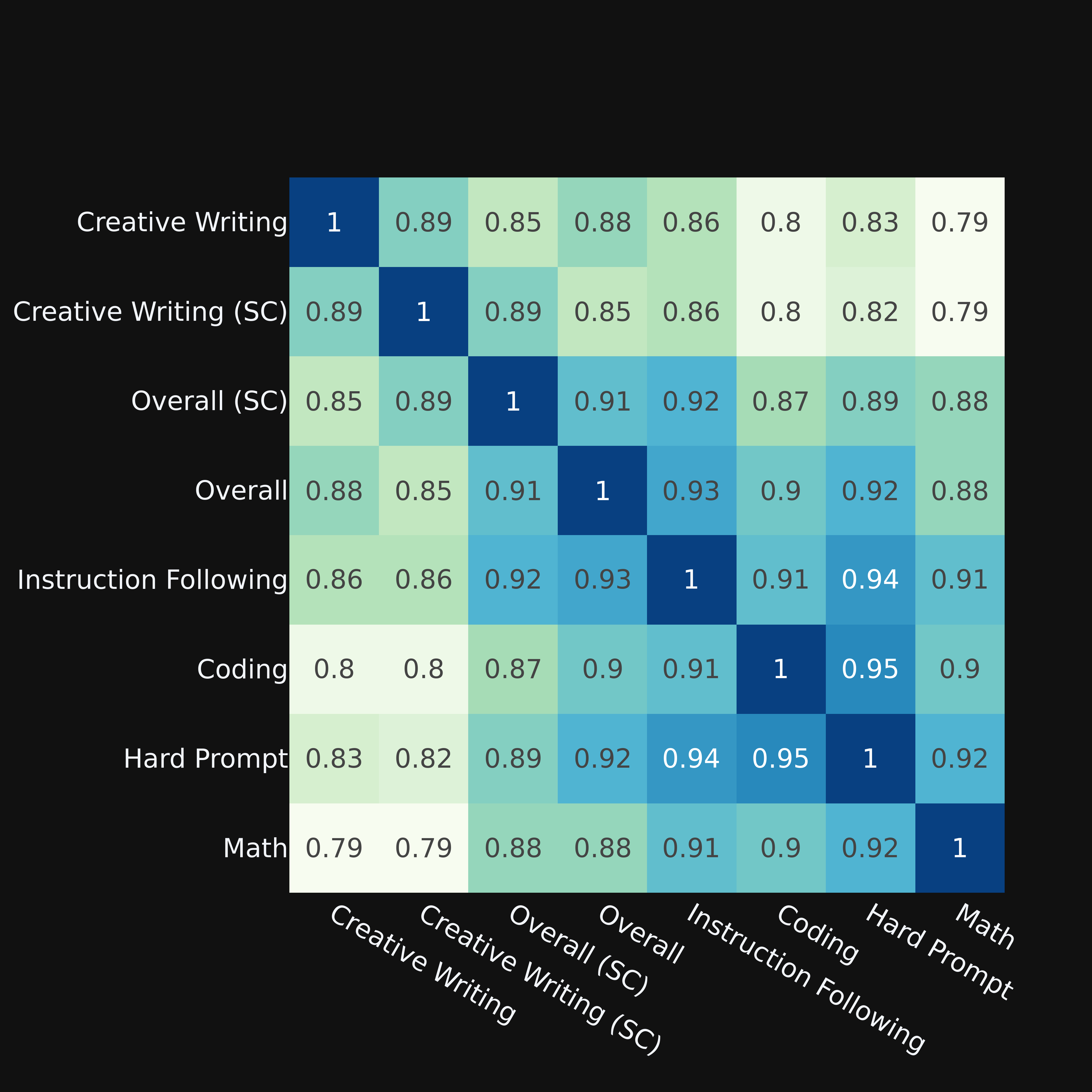 Figure 3 reports the Kendall correlations. First, technical leaderboards (Coding, Math, and Hard Prompt) tend to be more correlated with one another compared with Creative Writing. Secondly, consistent with the fact that it is a mixture of them all, the overall leaderboard is moderately correlated with all categories. The highest-correlation category with the overall leaderboard is Instruction-Following. Finally, it is worth mentioning that all these correlations are relatively high; the differences between categories are on the smaller side, although not insignificant.
