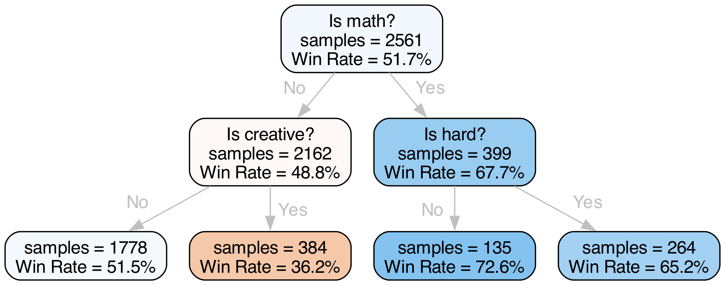 Figure 6. Gemini-1.5-Pro-002’s win-rate conditioned on categories as fitted using a standard decision tree algorithm. The selected battles are Gemini-1.5-Pro-002 against top Chatbot Arena models (o1-preview, o1-mini, chatgpt-4o-latest-20240903, claude-3-5-sonnet-20240620, yi-lightning).