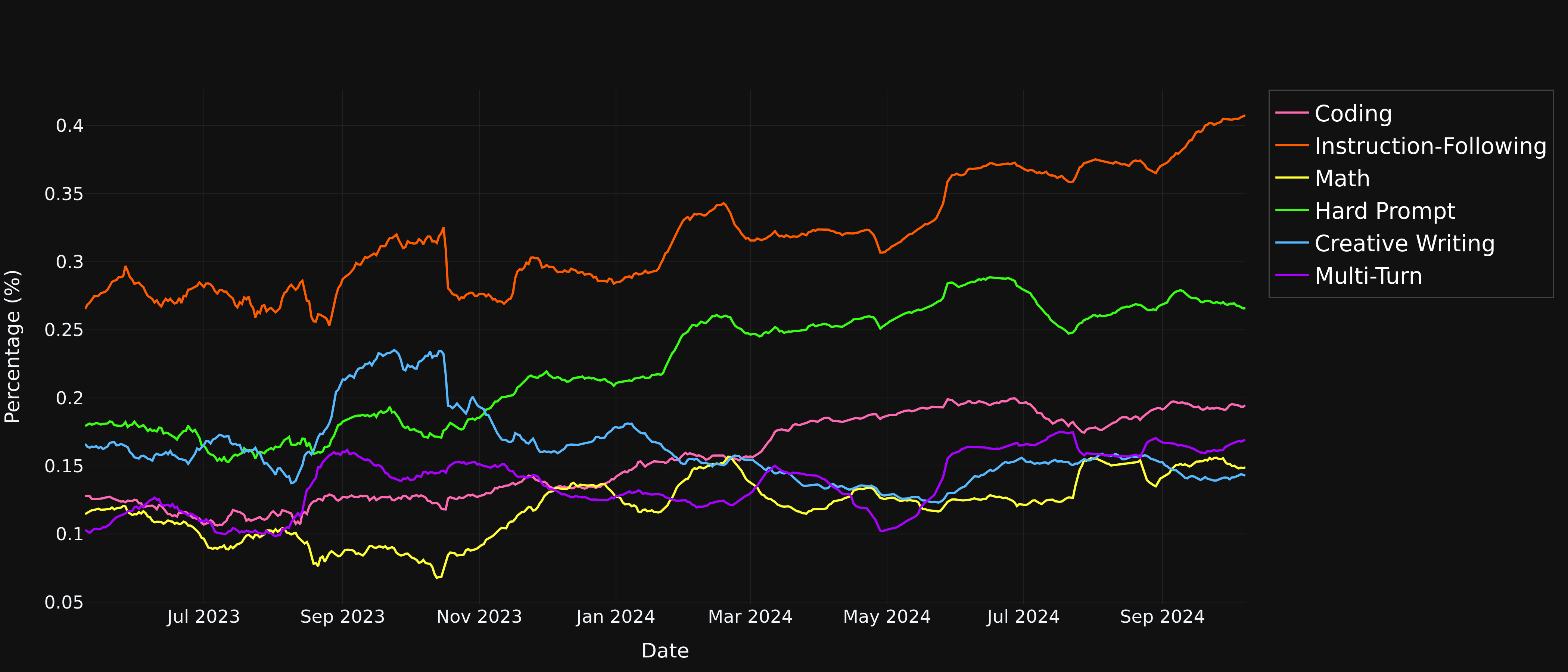 Figure 2: Percentage of Chatbot Arena Battles belonging to each category over time.