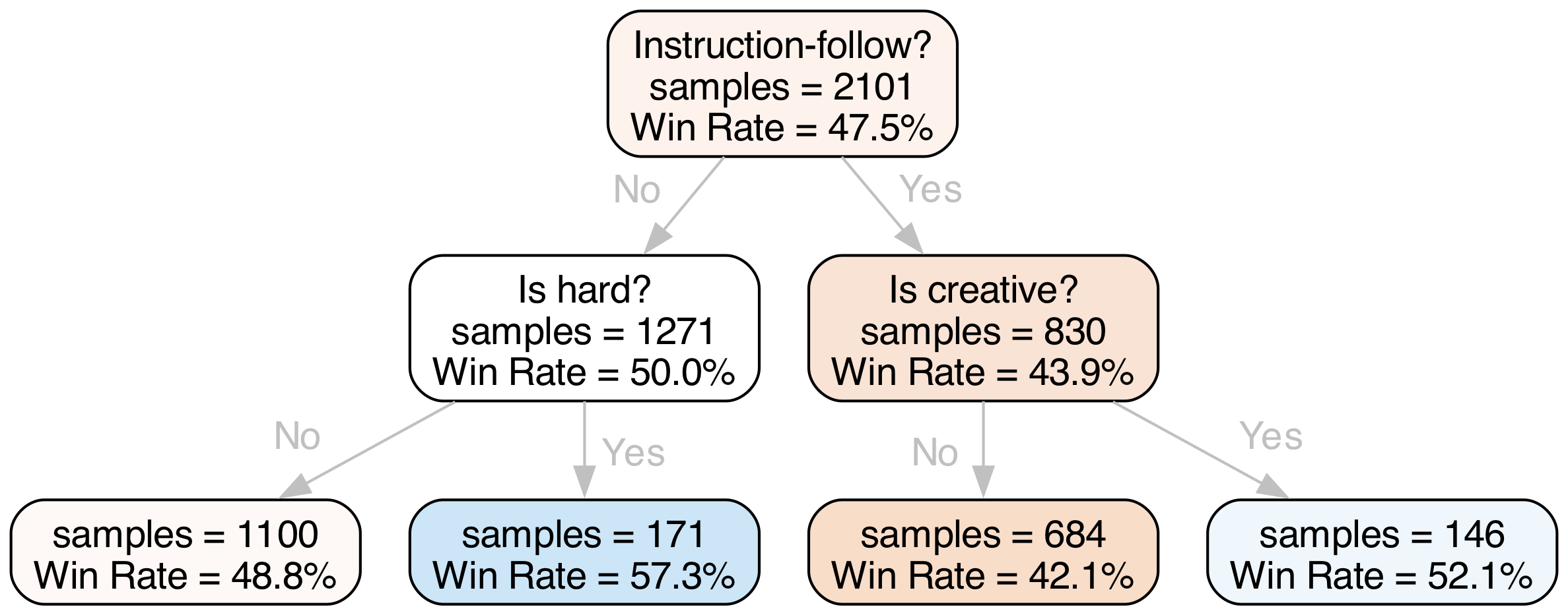 Figure 9. GPT-4o-Mini’s win-rate against Claude-3.5-Sonnet-20240620 conditioned on categories as fitted using a standard pruned decision tree algorithm.