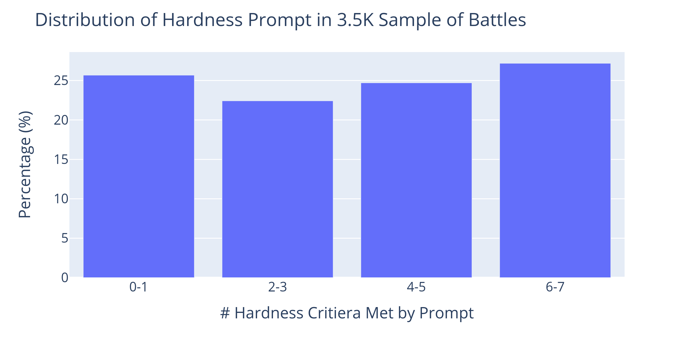 Figure 3. The percentage of prompts with number of hardness criteria met in 3.5K sample of arena battles. We observe a significant portion of the battles are classified as hard (~27%).