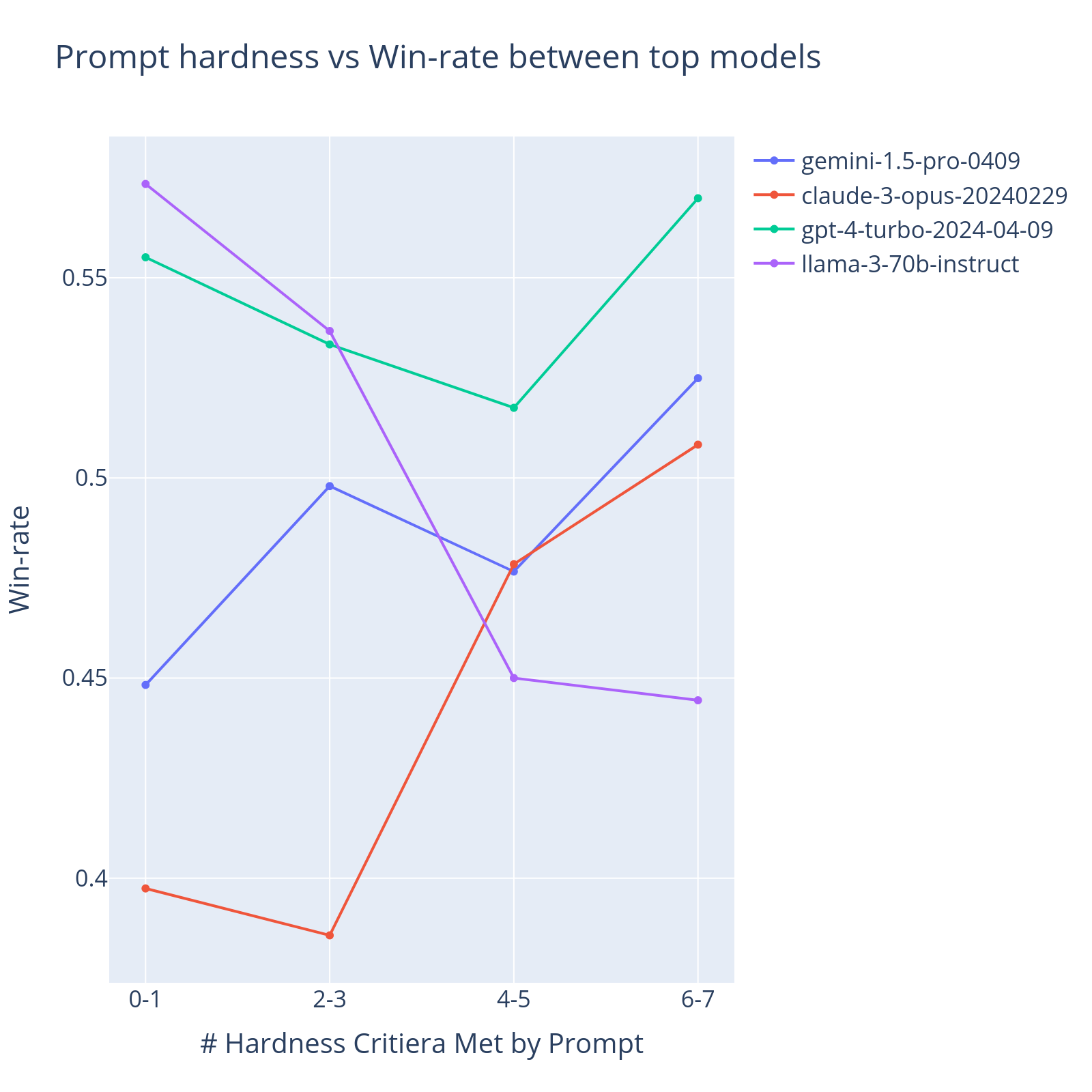 Figure 2. Several top models' win rate against the strongest 6 models over the intervals of number of key criteria satisfied. *English battles between strongest models: llama-3-70b-chat, claude-3-opus-20240229, gpt-4-0125-preview, gpt-4-1106-preview, gpt-4-turbo-2024-04-09, gemini-1.5-pro-api-0409-preview.