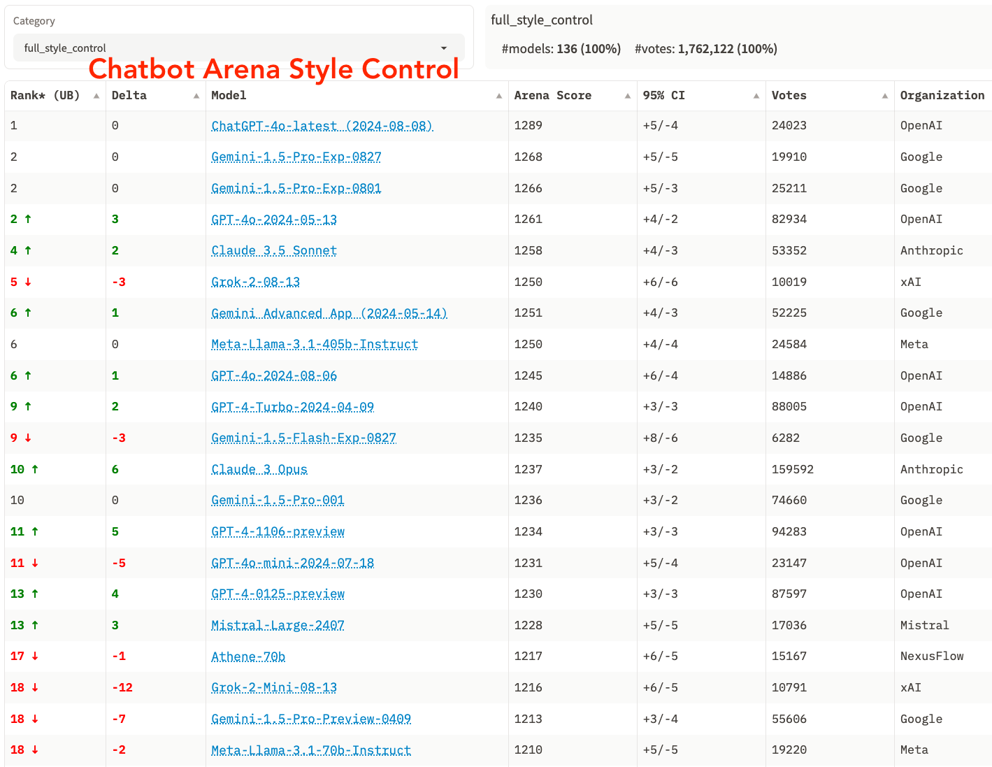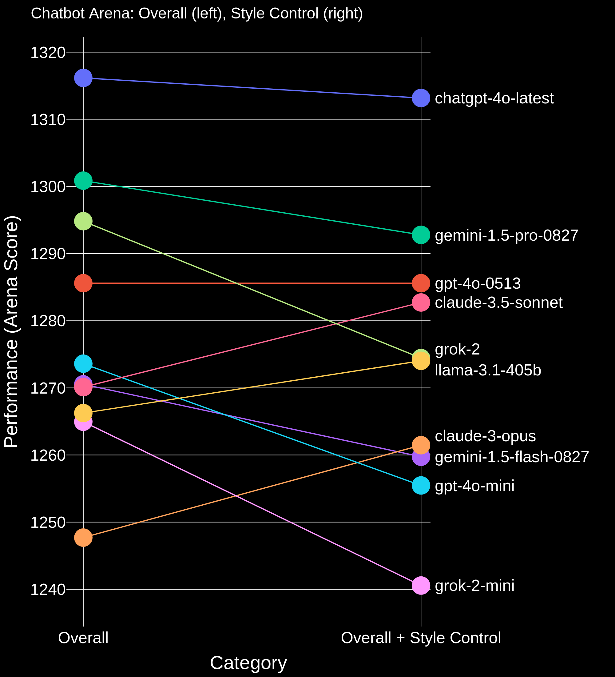 Figure 1. Overall Chatbot Arena ranking vs Overall Chatbot Arena ranking where answer length, markdown header count, markdown bold count, and markdown list element count are being “controlled”.