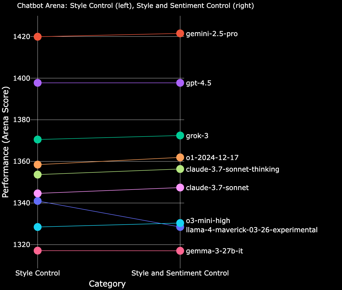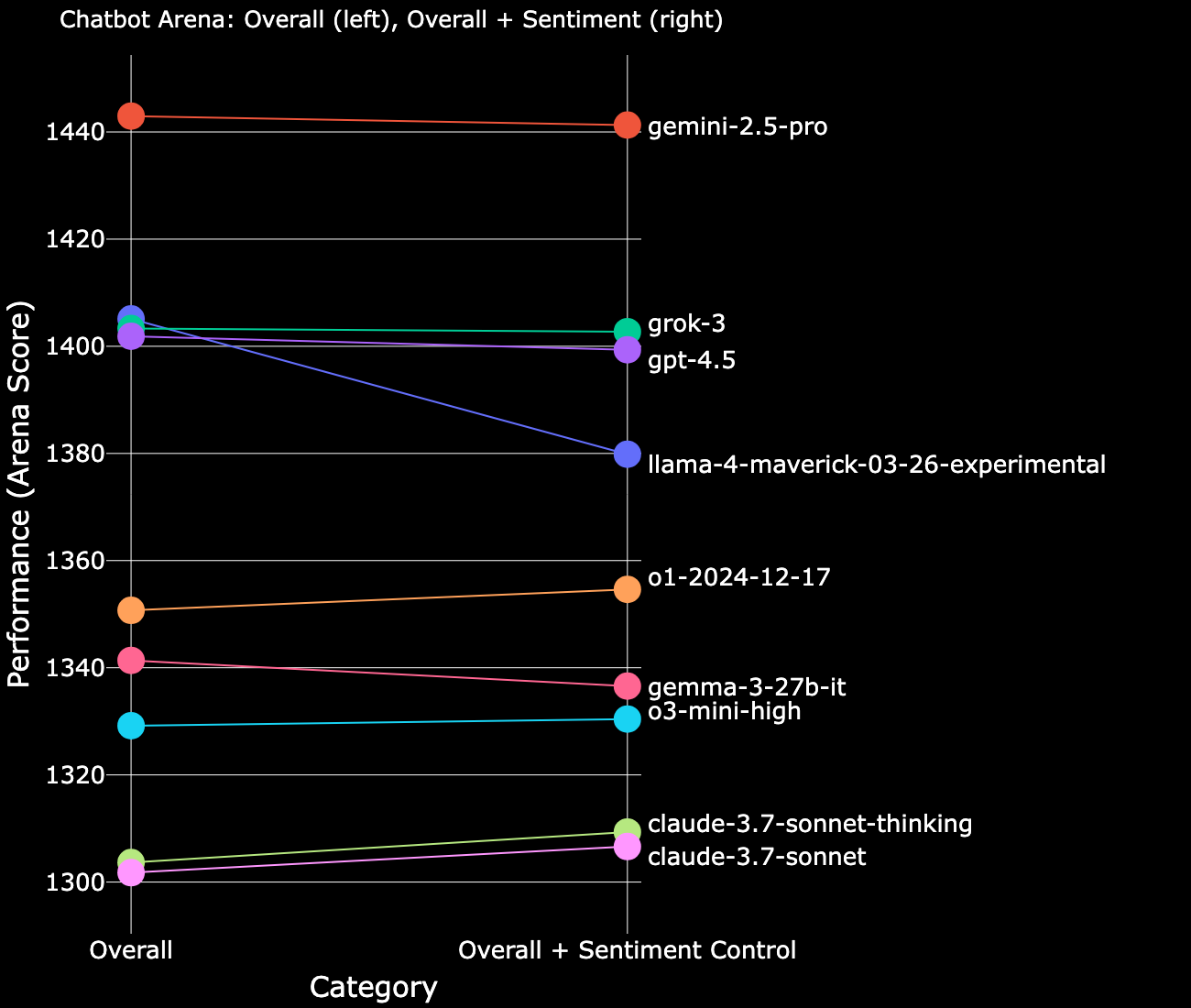 You may have noticed that recent models on Chatbot Arena appear more emotionally expressive than their predecessors. But does this added sentiment actually improve their rankings on the leaderboard? Our previous exploration revealed that style — including formatting and length — plays a significant role in perceived model quality. Yet, we hypothesized that style may go beyond layout—perhaps sentiment and emojis are just as influential.